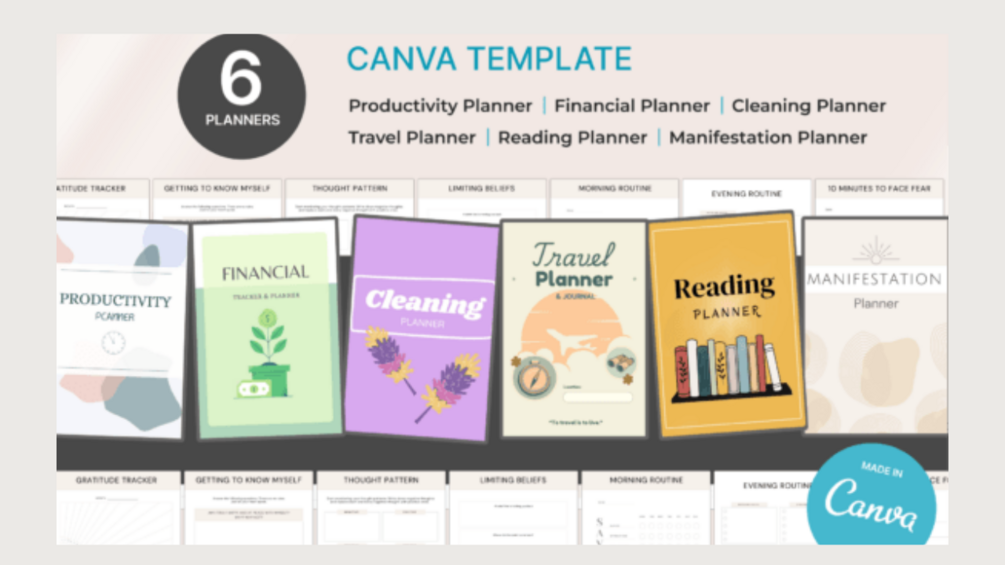 Want to start selling digital planners without the hassle of designing from scratch? Get instant access to 6 trending planners, fully editable in Canva!